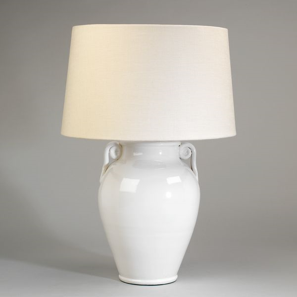 Based on a 9th century Etruscan vase, the white opaque glaze and scroll handles give this piece a simple, beautiful finish.