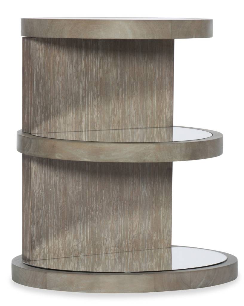 Product Description: Symmetry and style come together in the Affinity Round Table, featuring three shelves with glass inserts in tapering sizes and a tactile greige sand-blasted finish on Quartered Oak Veneers. The top shelf is 18 ½ wide, the middle shelf is 20 inches wide, and the lower shelf is 22 inches wide.