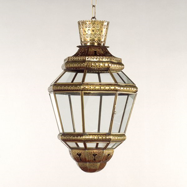 Inspired by traditional Moorish design and based on an antique, this lantern is distinctive by its pierced, repoussé decoration. Ornate yet streamlined, the brass finish adds warmth and character.