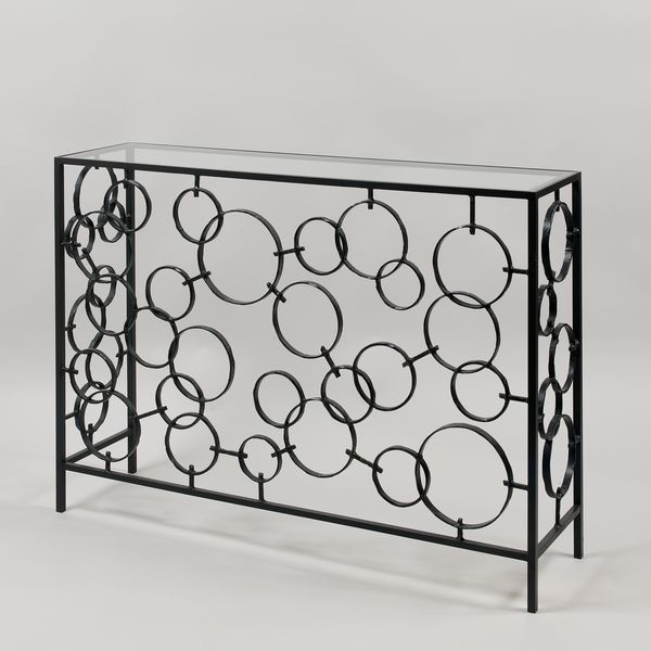 This console table has a modernist, aesthetic and artistic form. The sculptural metalwork is complemented with a clear glass top.Bronze (Glass)