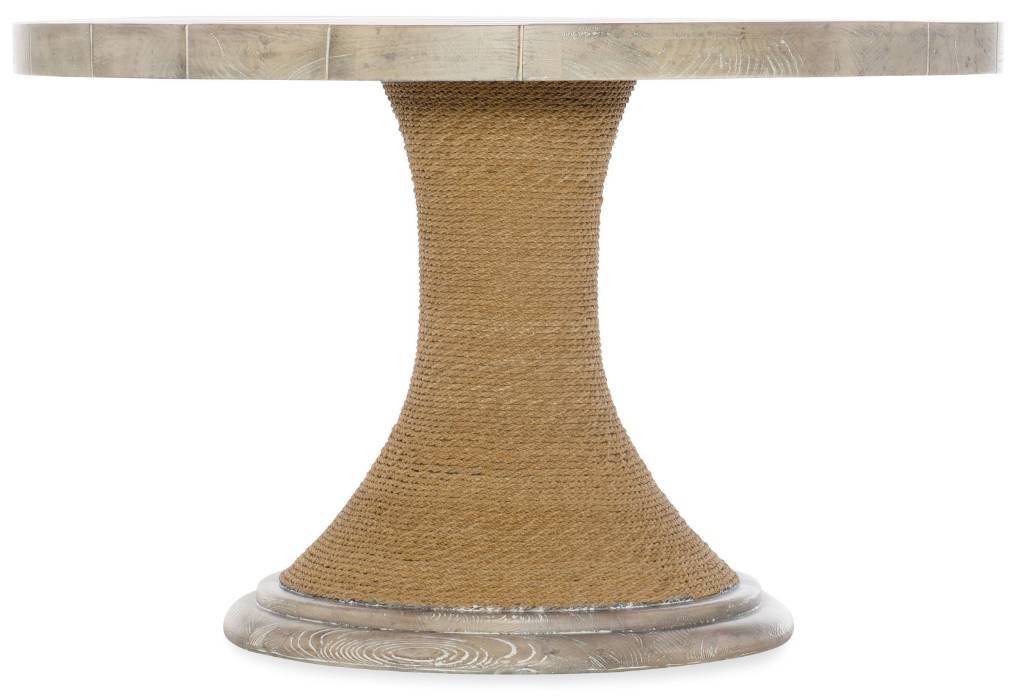 Product Description: With a modern yet casual style, the Armani 48-inch Round Pedestal Table is an eclectic mix of materials including Pecan Veneers with a rope-wrapped base. The Buff Almond finish is a serene lime washed tonal finish with subtle texture. Includes table top and base.