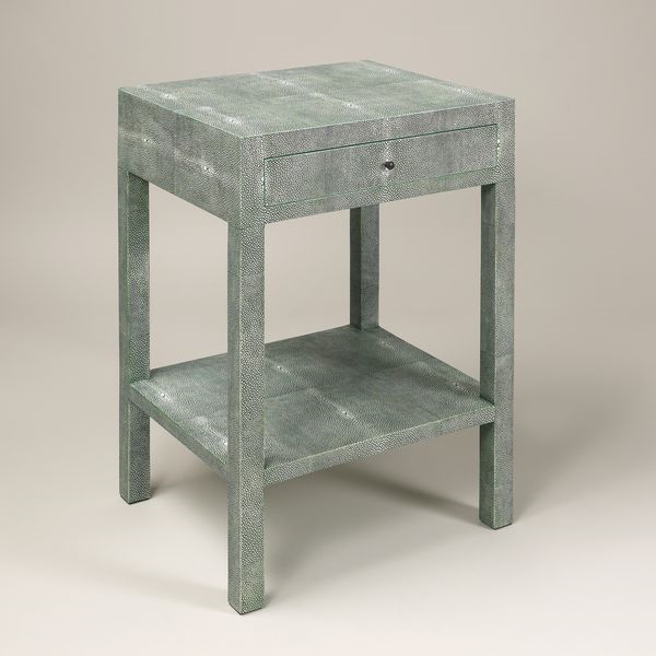 The faux shagreen finish on this bedside table enhances the simple shape. The shagreen wraps around the entire table to create a rich textural effect.Green Shagreen
