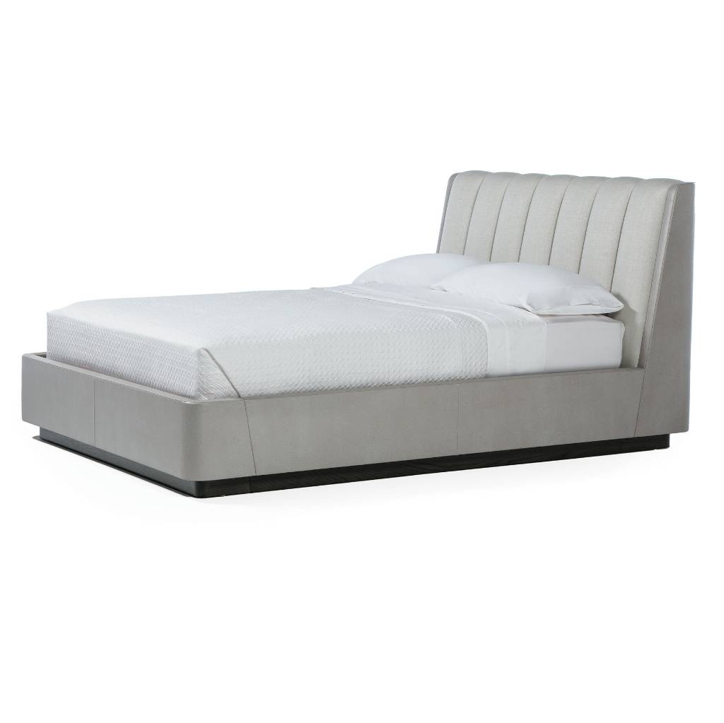 King Bed: Oak Sable Base with HOLLY HUNT Jet Set St. Moritz Leather Body and Great Plains Casablanca Sea Mist Channels