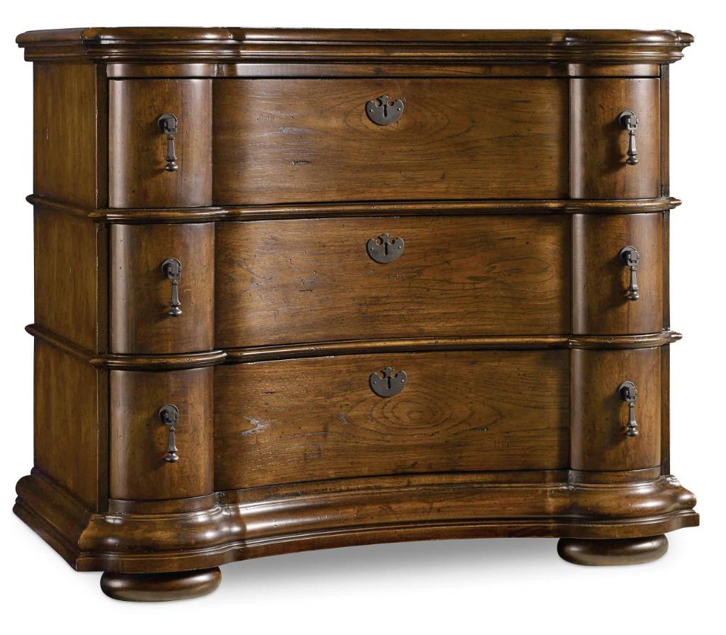 Product Description: A softly curving concave front, ornamental shield-shaped escutcheon hardware and tear-drop-shaped pendants in a time-worn bronze color, along with chic bun feet, come together to create a piece that embraces both grand elegance and beloved, time-honored forms. Featuring a soft casual pecan-colored rustic finish, practical storage is offered in this chest with its 3 roomy drawers, including a cedar-lined bottom drawer and drop-in felt liner in the top drawer. There’s also a touch-light with dimmer switch and cord clip for electronics.