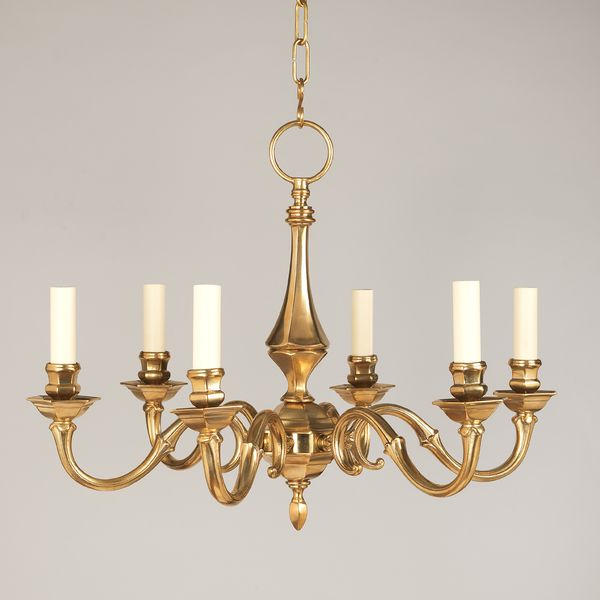 Based on an antique we discovered in Holland, the chandelier has a shallow profile with simple leaf detailing and angular and curved lines.Brass
