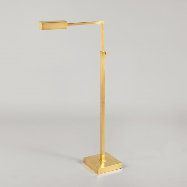 Distinctive by its compact form and streamlined aesthetic, this floor lamp is highly versatile. The arm can be raised up or down and the rectangular hood has a tilt mechanism. The square arm and adjuster complement the linear square base.