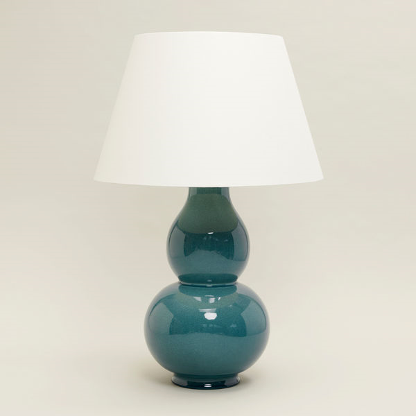 This table lamp is defined by its delicate gourd-shaped body in slip cast ceramic. This beautiful piece is timeless in style.Glazed Ceramic (Teal)