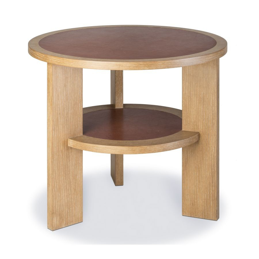 Description : 1940's inspired cerused light oak round side table with inset leather top and shelf. Fabric Shown : J101-03 Palma - Port