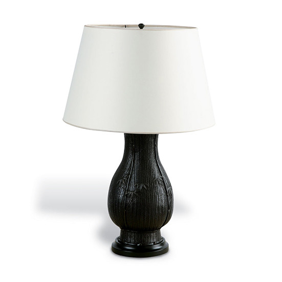Description : Cast Japanese urn table lamp on a wood base. Double cluster light fixture with an adjustable stem. Includes patterned paper shade and diffuser. Finish : Oiled Rubbed Bronze with Dark Ebonized Wood Base