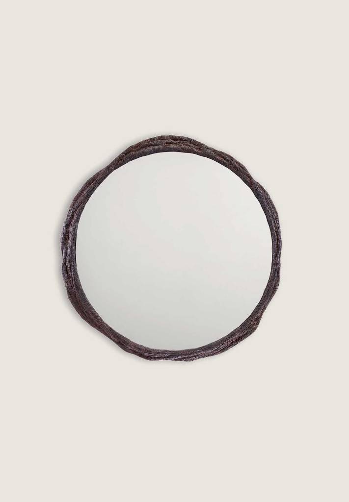 Inspired by Japanese techniques for preserving wood, the Bark Mirror’s frame echoes the organic texture of tree bark.