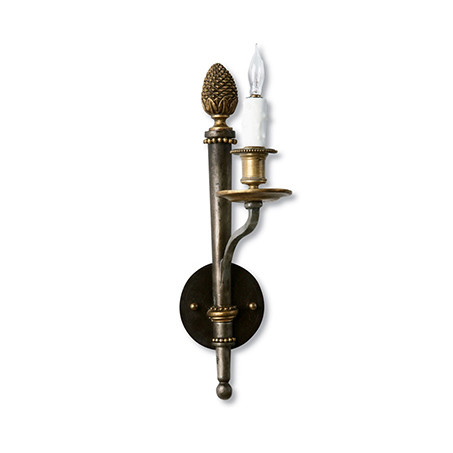 Description : Neo-classical style gilt and steel sconce with waxed candle sleeve. Wired for 25 watt candelabra bulb. Finish : Antiqued and Distressed Gilt and Steel
