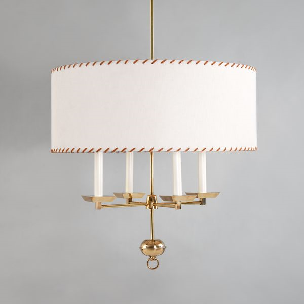 Large in scale this light features a linen shade with a hand-sewn leather trim and striking square candle cups.Brass