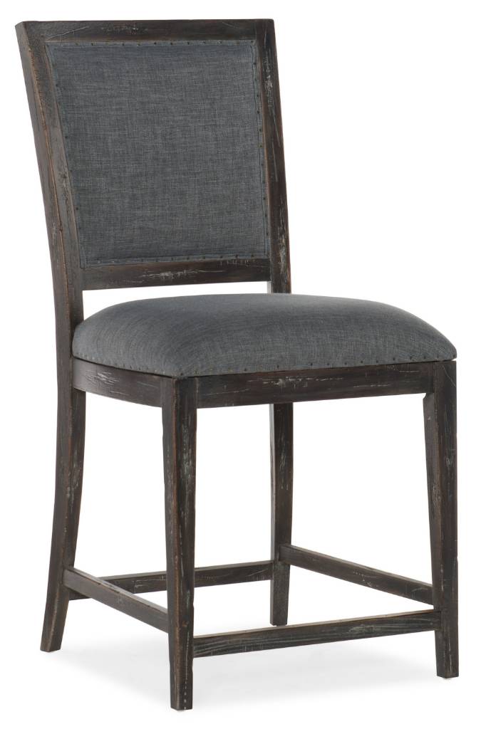Product Description: The perfect companion to your counter-height dining table or island, the Beaumont Counter Stool exudes authenticity, trimmed with tiny bronze carpenter nails and evoking a sense of American antiques. Upholstered in a slate-colored fabric, the wood trim is finished in French Press, reminiscent of freshly ground coffee with hints of brown and black, and with distressing. Height: 43.5 inches; Depth: 25 _