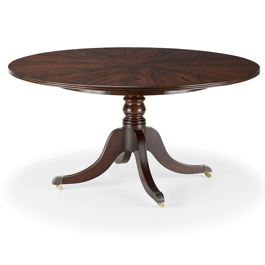 Description : English dining table on single pedestal. Mahogany and crotch mahogany veneer.