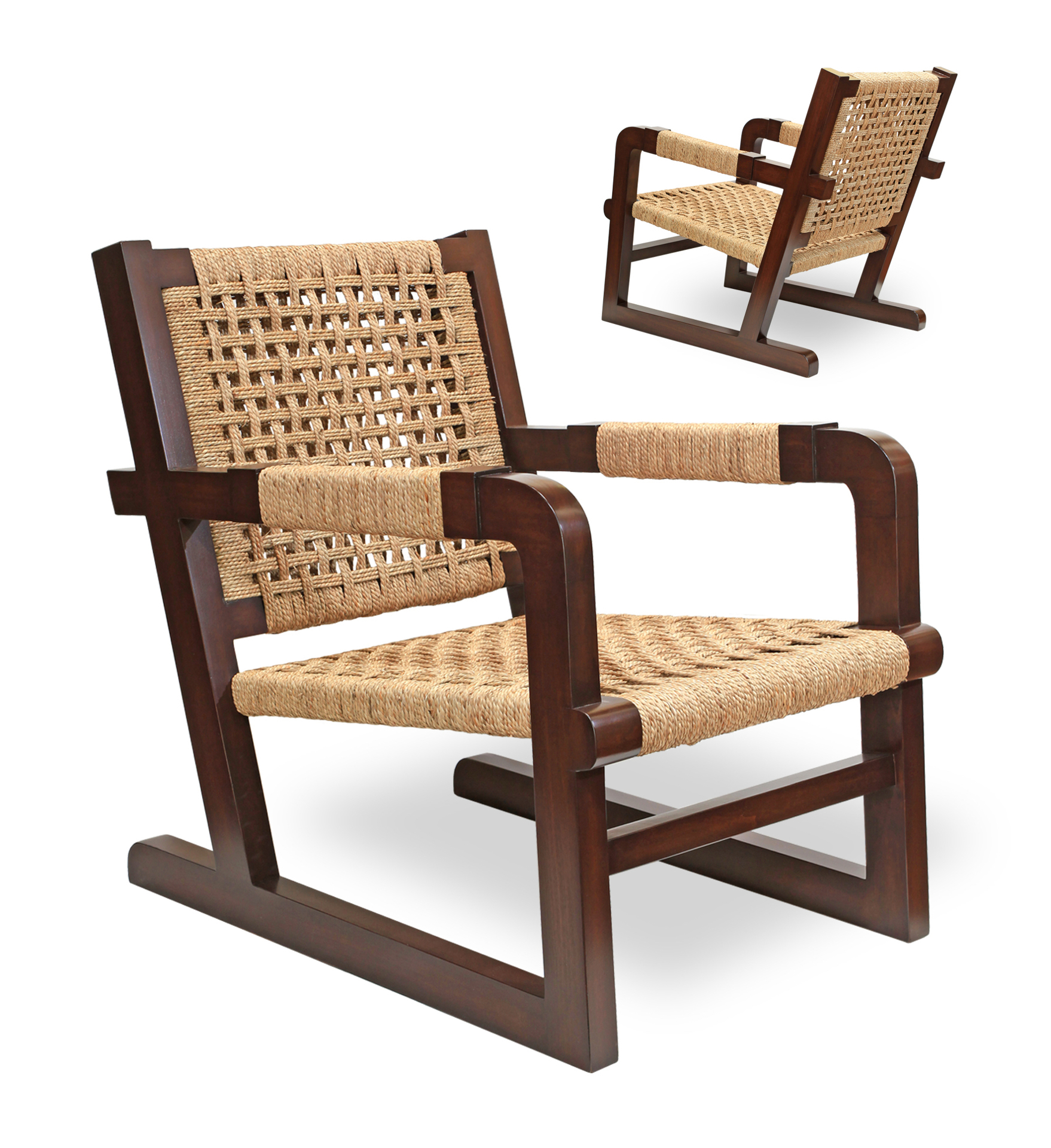 Reproduced from the 40's original, it combines a sculptural hardwood frame with hand-woven and lPoplared sea grass seat back and arm detail. Perfect in pairs as a contrast to fully upholstered pieces.