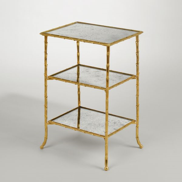 This elegant table was inspired by an original 1940s piece, purchased in a Parisian antique shop. The cast brass frame is finished with acanthus leaf decoration, complementing the antique mirror shelves.