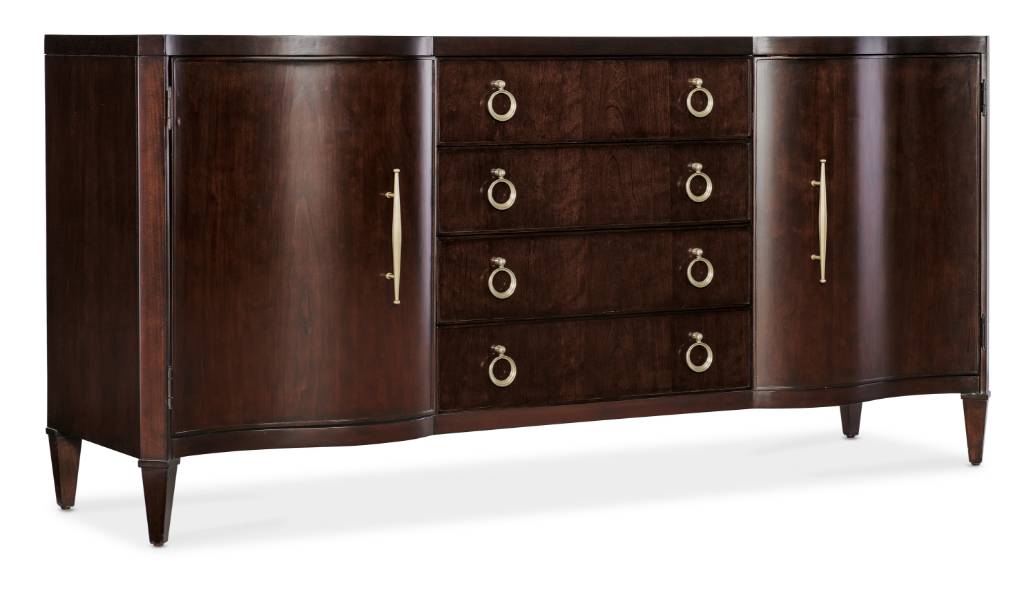 Collection Features: Hooker Furniture's Bella Donna collection is characterized by its elegant forms, rich with shape and movement. Channeling Sophia Loren’s timeless sophistication and style as its muse, Bella Donna appeals to the classic consumer, but with a little “edge” to their design style. Caviar, the primary finish for Bella Donna, has a deep translucent tone on rich cathedral cherry veneers. Akoya, representing the purest white pearls found in the world, is a perfect accent finish, adding sophistication and a bit of glam. Unique design details include reeding on selected pieces that create a “curtain effect,” reverse breakfront serpentine silhouettes, glass tops, and exposed metal legs. Adding the finishing touch, this whole home collection features custom designed hardware in a champagne finish, including both traditional and modern forms.