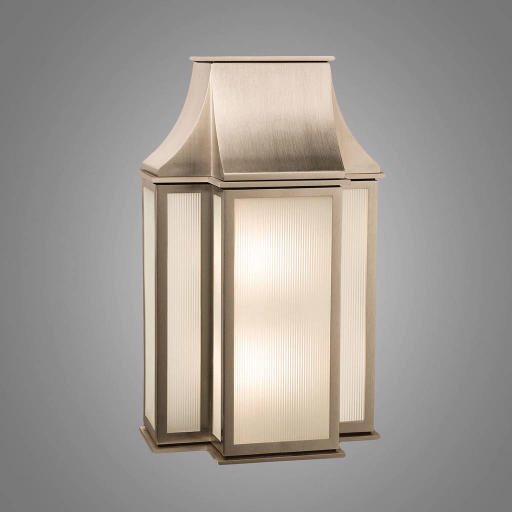 This oversized brass sconce is a companion to the Belvedere Lantern which reinvigorates a traditional old world lantern. Available in two sizes, four metal finish options, and either frosted or clear ribbed glass.