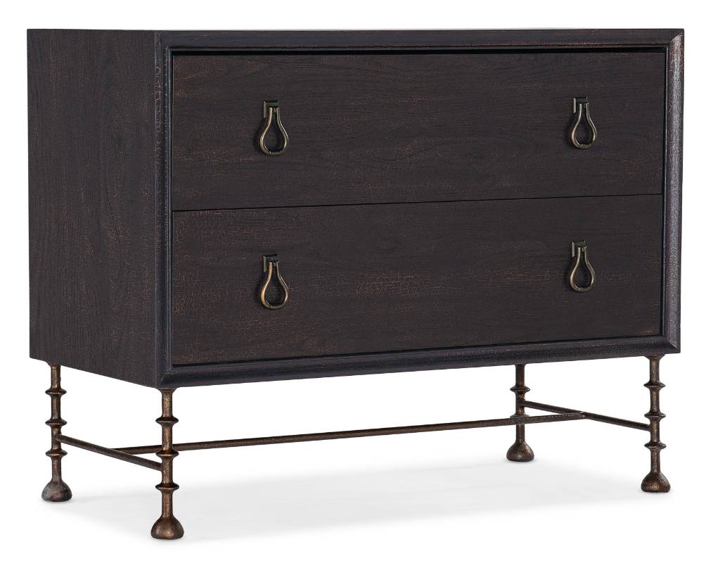 Product Description: Warm and rustic, the Big Sky Bachelor’s Chest has a vintage design pairing a case crafted of rustic Pecky Hickory Veneers in the dark Charred Timber finish with turned metal legs and stretchers. Featuring two drawers, the top drawer has a removable felt liner and the bottom drawer is cedar-lined. There’s an FC707 power bar with 3 electrical outlets and one live USB port and a cord clip on the back.