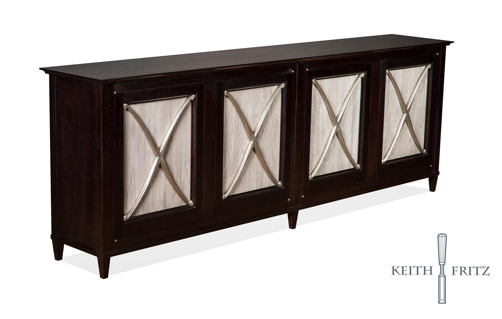 The Blair cabinet pulls from Directoire influences, with its simple form, classic proportions, and tapered legs, but this cabinet is also decidedly modern with the silver leafed X's over antiqued mirrors. This design can accommodate a flat-panel TV-lift mechanism or house custom electronics.