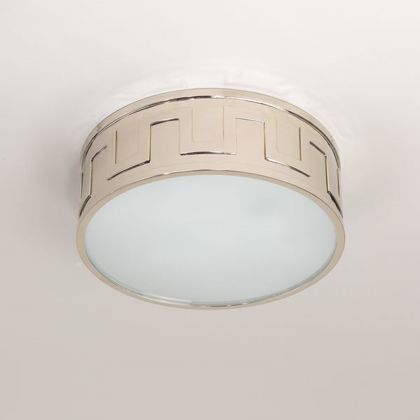 Inspired by a classical Greek ornament, this light is made from nickel plated brass. The ancient key pattern adds definition and complements the frosted glass shade.Nickel