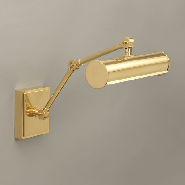 Inspired by an antique reading light, this design has a square backplate, circular brass hood and adjustable joints on the arms to allow for a variety of positions.