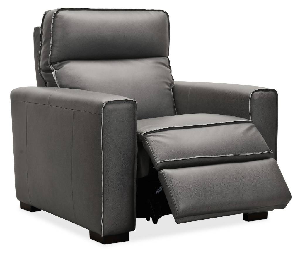 Product Description: The Braeburn Power Recliner with Power Headrest exudes soft modern style with a bustle back, open flange stitching detail and square wood feet in a dark finish. The leather cover is in a medium gray semi-aniline top grain called Rangers Gravel.