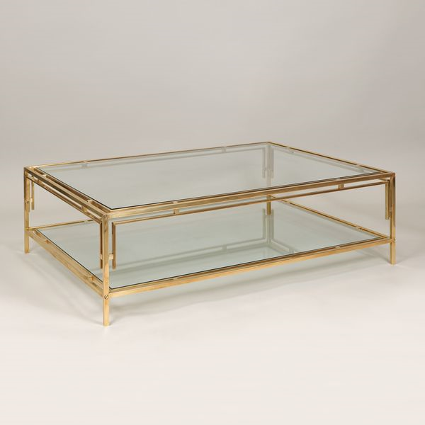 This large coffee table is ideal for displaying books across the two levels of glass shelving.Brass (Glass)