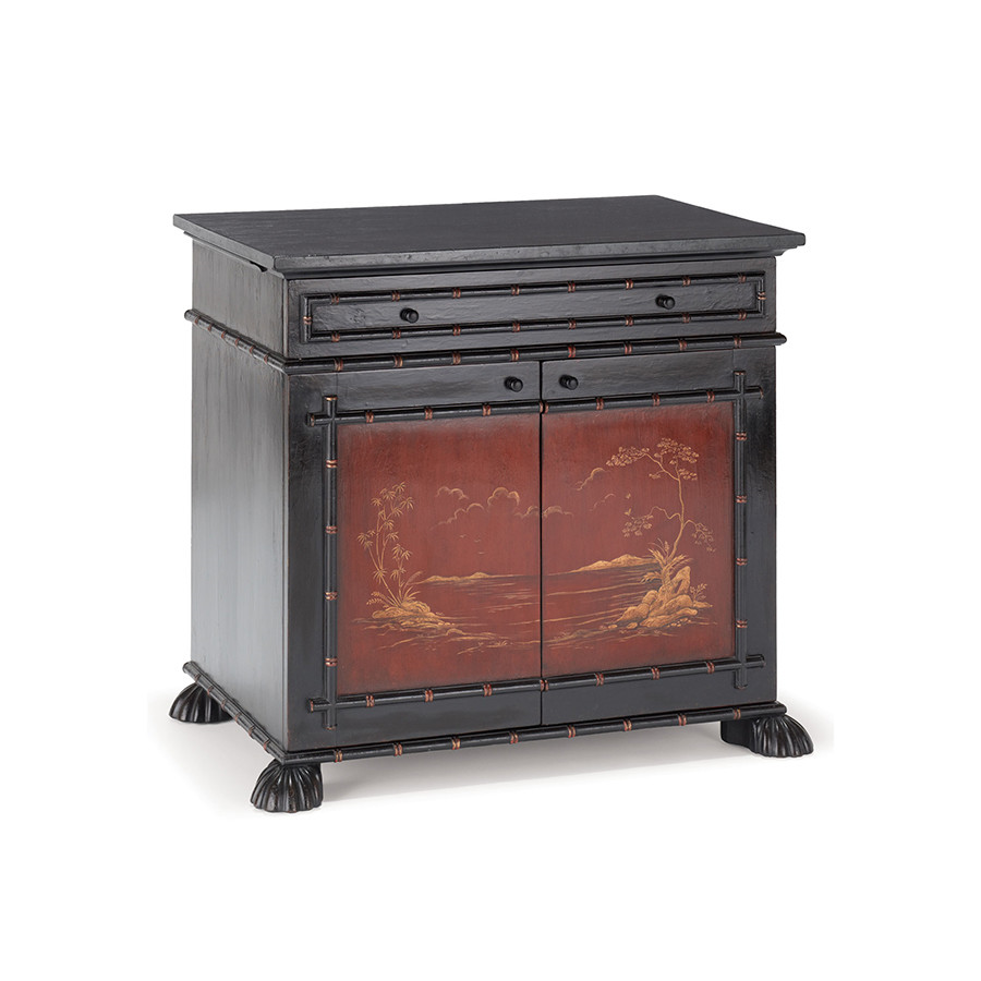 Description : Red crackled lacquer with chinoiserie hand carved faux bamboo cupboard with two red chinoiserie inset front door panels and hand carved shell feet.