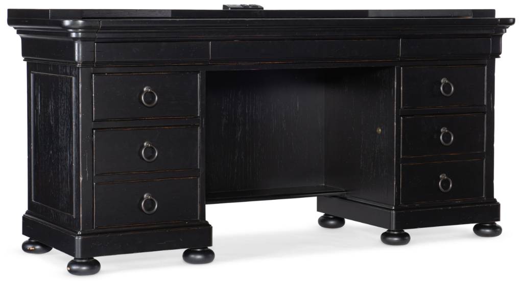 Product Description: Casual yet refined and stylish, the Bristowe Computer Credenza sets a professional and inviting tone for any work-from-home space. Crafted of Pecan Veneers in a Tuxedo black paint finish with touches of warm brown and accentuated by 4 bun feet on each side of the desk, there are 7 drawers including the top left and right drawers with full extension metal ball bearing slides with removable divider inserts. The top drawers have finger grooves to open and the bottom drawers are locking file drawers with pendaflex filing system and full extension metal ball bearing slides. There is a FC627 power bar with 2 electrical outlets and 2 USB ports on top. The desk top area above the center drawer pulls out for added work surface.