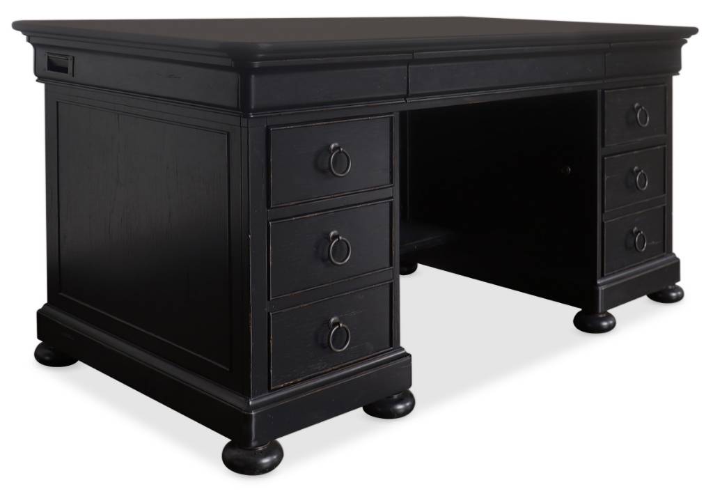 Product Description: Casual yet refined and stylish, the Bristowe Computer Credenza sets a professional and inviting tone for any work-from-home space. Crafted of Pecan Veneers in a Tuxedo black paint finish with touches of warm brown, the desk is accentuated by oil-rubbed bronze-finished ring hardware and chic bun feet. Offering 7 drawers, the top left and right drawers are on full extension metal ball bearing slides with removable divider inserts. There’s one removable writing slide and one removable pencil drop-in that can be used on either side. The bottom drawers are locking file drawers with a pendalfex filing system and full extension metal ball bearing slides. The center drop-front drawer allows for keyboard use. Finished on all sides, so the desk can float in a room.
