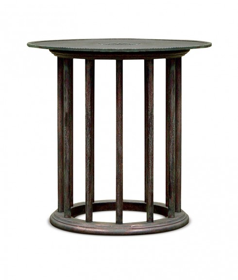 20”dia x 20”htop is not attachedstandard size only28 lbspatinated bronze top with antique wood basebronze and wood