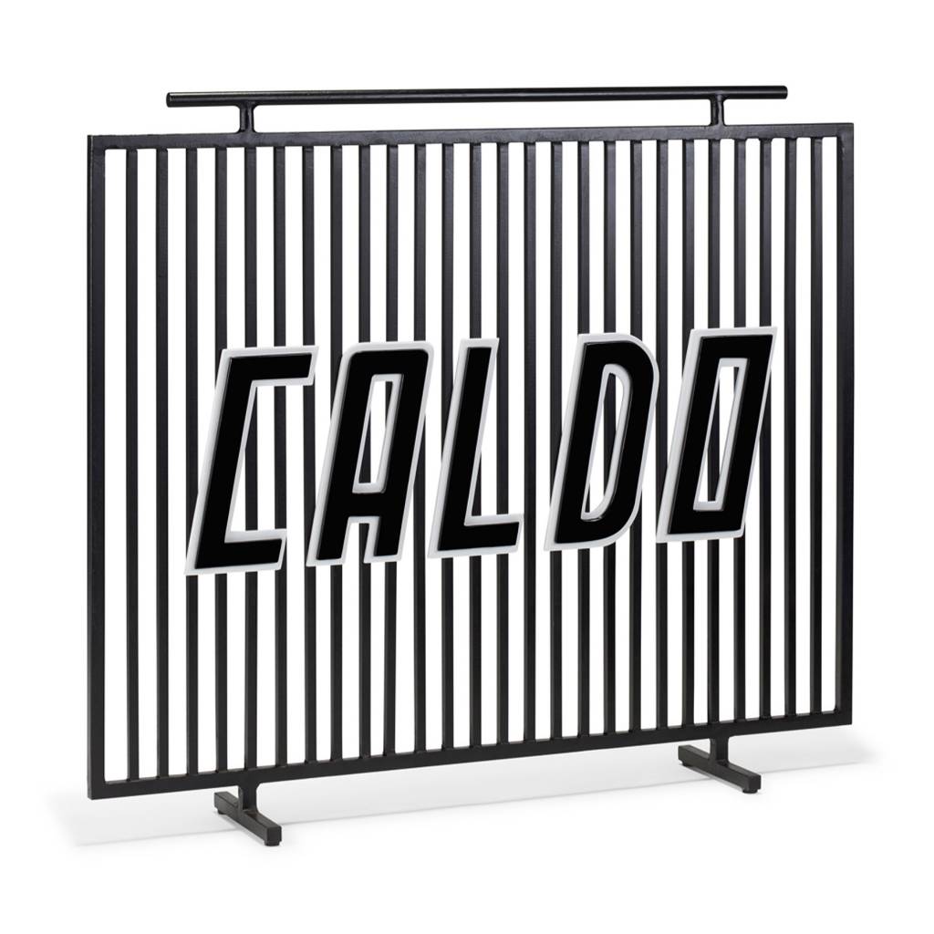 Inspired by California artist Ed Rustha, who incorporates words into his work, this fire screen features the word Caldo (Italian for “hot”) in white hot.