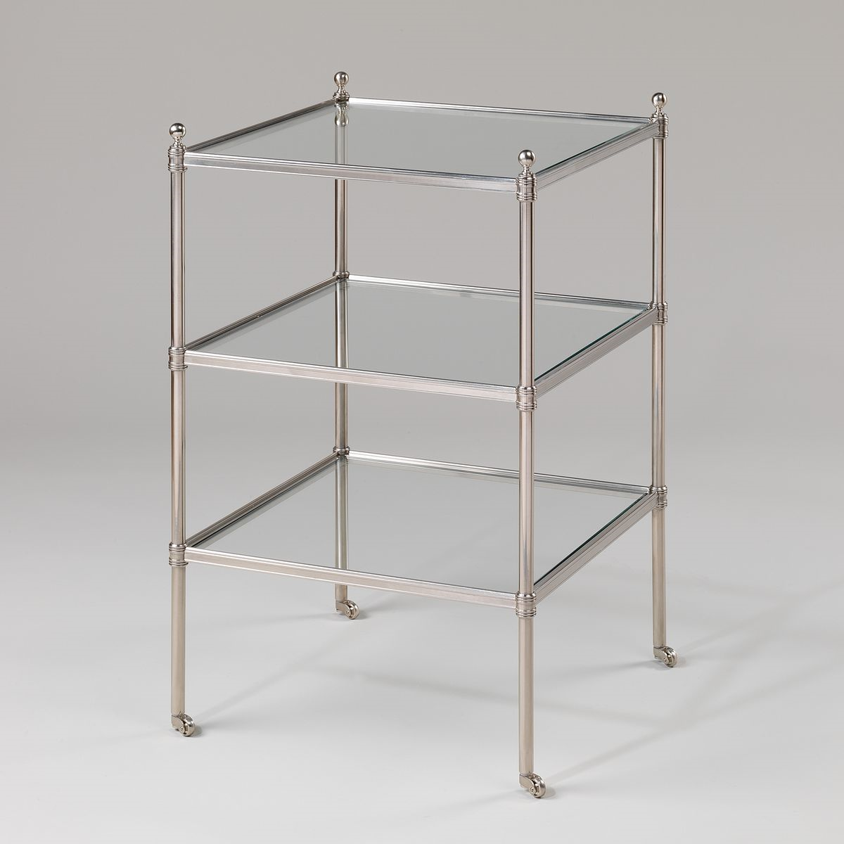 This table has a distinctive and streamlined design with eclectic offset legs. While produced from traditional materials, the piece has a contemporary style.Nickel (Glass)