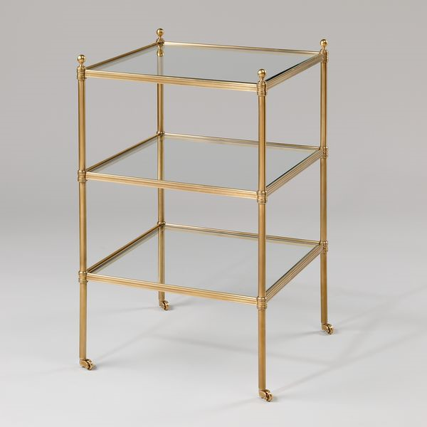 Based on a Regency piece, this table retains a timeless quality. A classic occasional table, the pairing of brass or nickel with glass, mirror or faux shagreen and square etagere makes this such a collectible piece.