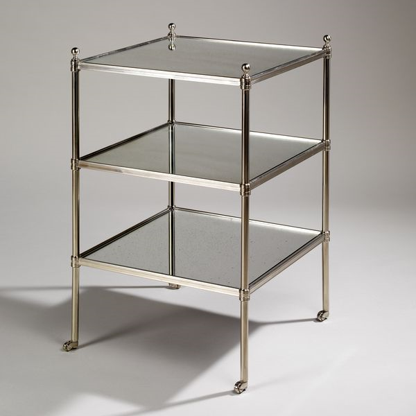 Based on a Regency piece, this table retains a timeless quality. A classic occasional table, the pairing of brass or nickel with glass, mirror or faux shagreen and square etagere makes this such a collectible piece. The distressed antique mirror complements the detailed finish.
