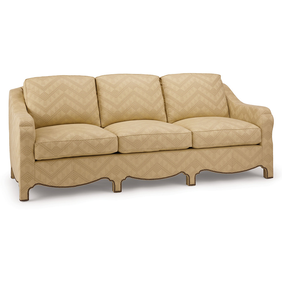 Description : Fully upholstered sofa with three loose seat and back cushions (25/75 down). Upholstered feet with scallop base and optional nailhead detail. Fabric Shown : JW 7300 Hitchcock Woven - Golden COM : 21 Yds COL : 378 Sq Ft COT : 48 Yds