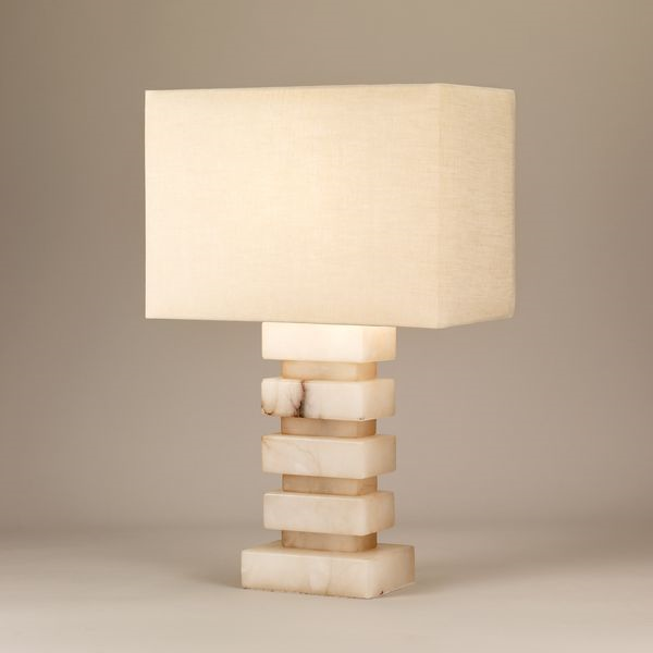 With a nod to modernist architecture, this lamp is formed from carved blocks of smooth alabaster that resemble a tower. The contrast in shapes creates the illusion of two colours with the light and shadow reflecting on the veined natural stone.