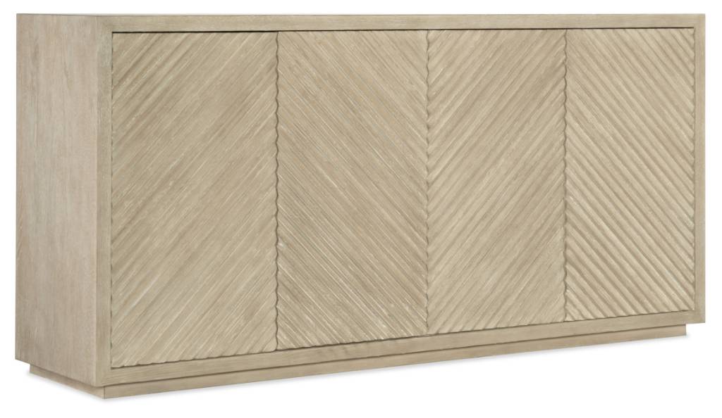 Product Description: Create a serene and tranquil haven with the Cascade Credenza in an organic soft taupe finish on Oak Veneers with a tactile reeded front in a diagonal pattern. Modern and relaxing, the Cascade Credenza has four doors with soft-close hinges and touch latches with one adjustable shelf behind each pair of doors.