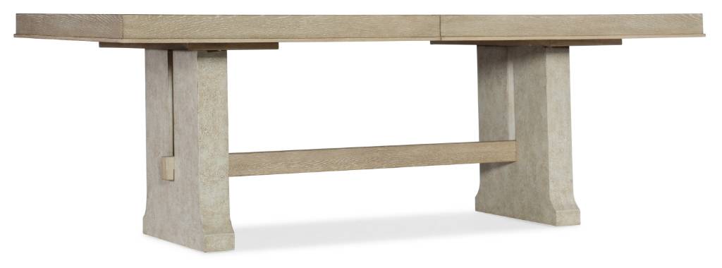 Product Description: Linger for memorable meals with family and friends at this inviting modern farmhouse-styled table that offers a retreat from your fast-paced lifestyle. Crafted of Oak Veneers, the Cascade Rectangle Dining Table features a stretcher that joins the 2-pedestal base, with the entire base finished in a creamy-colored textured gesso with crackle. The tabletop is a soft taupe finish on oak veneers with dry brushing. With one 22-inch leaf, the table extends to 106 inches long, accommodating 2 arm chairs and 6 side chairs.