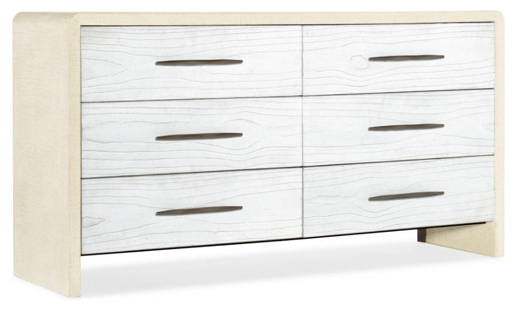 Product Description: Svelte and sophisticated in a serene two-tone finish combining a palette of white, cream and taupe, the Cascade Dresser with six self-closing drawers is a stylish statement piece brimming with storage. The top drawers have a removable gray felt liner, the right top drawer has a removable gray felt jewelry tray and the bottom drawers are cedar-lined. The outside of the case is in Pebble Beach, a lacquered burlap finish, and the drawer fronts are in a soft white finish in cast resin accented by champagne-colored bar pull hardware.