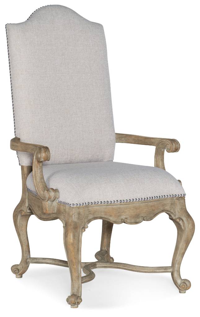 Product Description: Celebrate gracious living with the romantic Castella Upholstered Arm Chair with a lovely scalloped apron that is mirrored on the scallop-shaped upholstered back. The refined rustic Antique Slate finish with the appearance of natural wood bathed in sunshine adorns the carved cabriole legs and serpentine stretchers. The soft upholstery in a neutral performance fabric creates a serene neutral color palette to add relaxation to your gatherings around the table or in the family room.