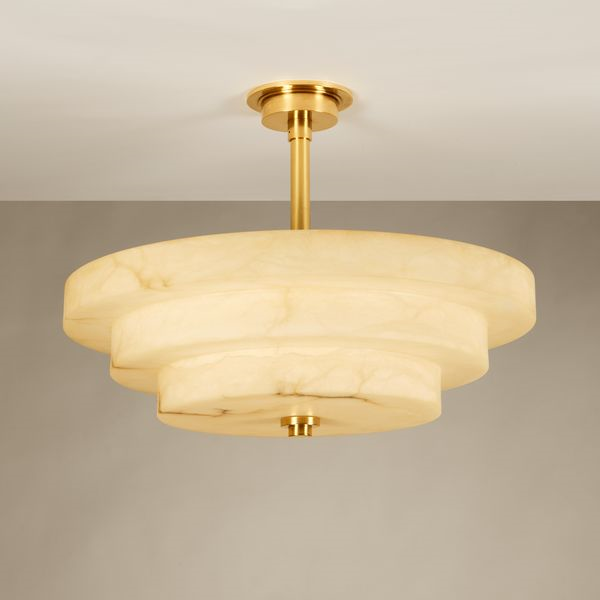 Inspired by a 1930s Art Deco antique, this design is large in scale. The hand finished stepped alabaster bowl pairs beautifully with the round finial and ceiling plate.Silver (Large)
