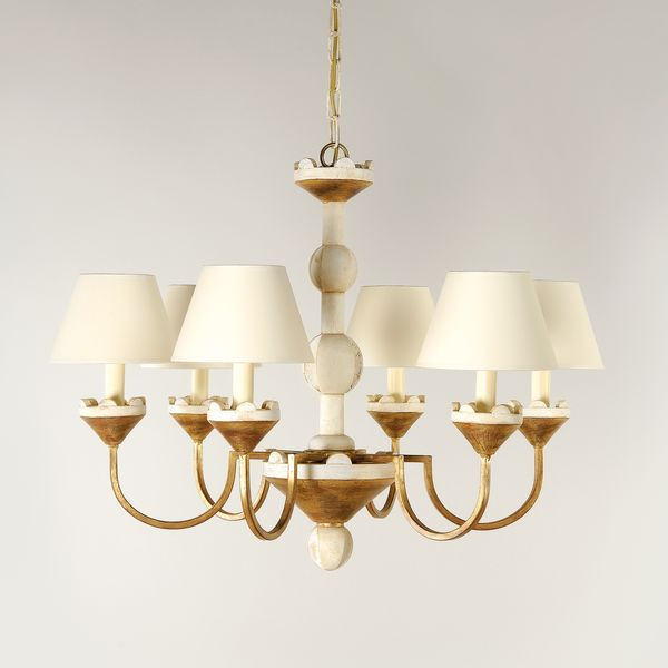 This chandelier has a 1940s French feel with a sophisticated retro style. The turned-wood is decorated in distressed ivory and either gilt or silver, creating a striking contrast of textures and tones.