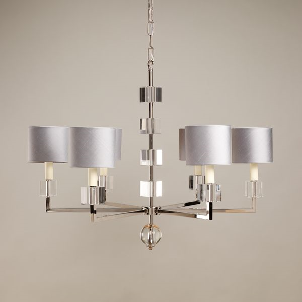 Influenced by the style of the 1940s, this chandelier is made with nickel and given substance with glass cubes.Nickel