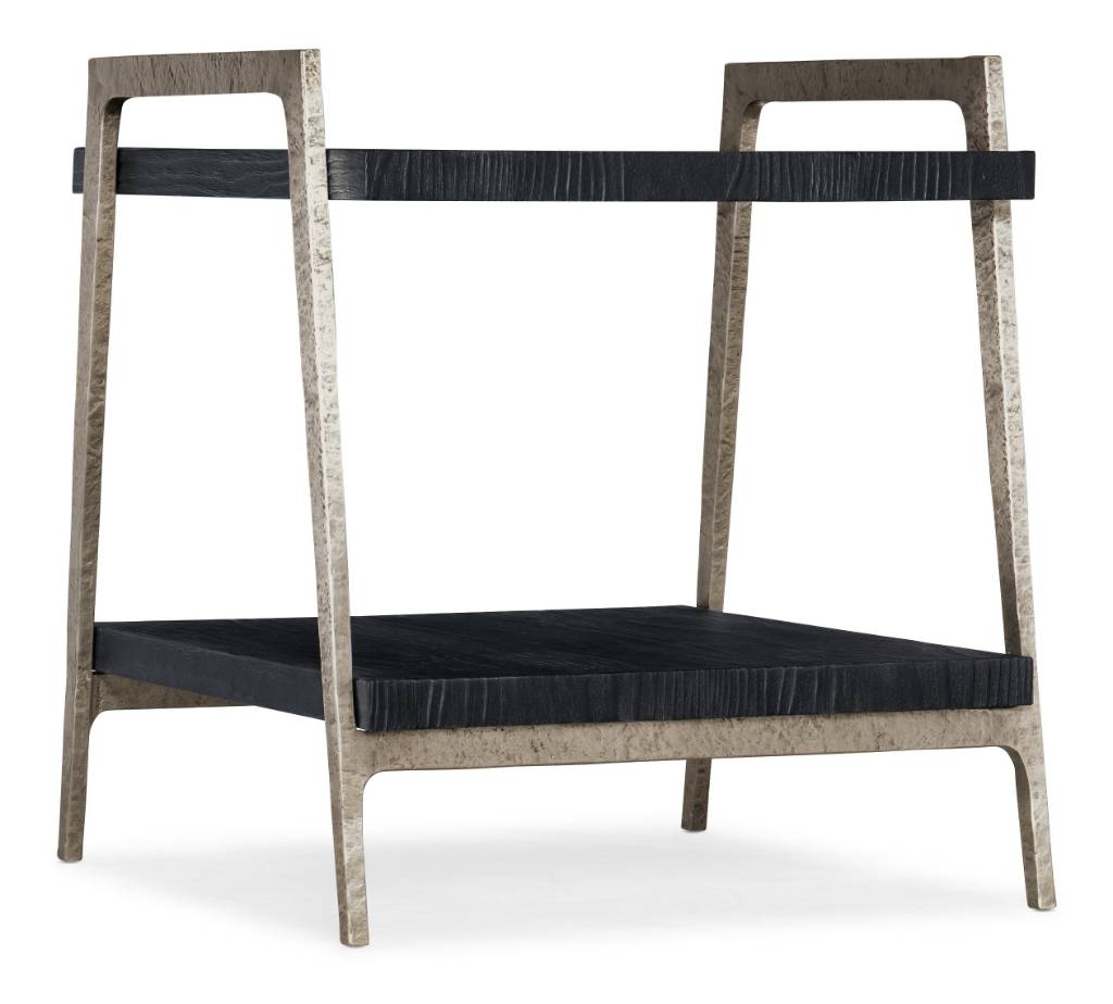 Product Description: Blending Pine Veneer shelves in a Charred Black finish featuring a Japanese technique to achieve the look of burnt wood with a hammered pewter frame and legs, the Chapman End Table is casual, rustic and inspired by city spaces.