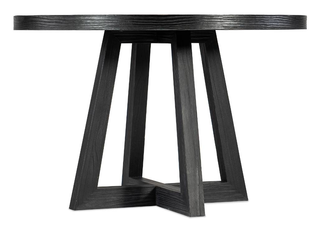 Product Description: In a chunky and chic silhouette, the Chapman Round Dining Table is casual with a modern twist and features a Charred Black finish on Pine Veneers, a Japanese technique to achieve the look of burnt wood. Will accommodate up to 6 chairs.