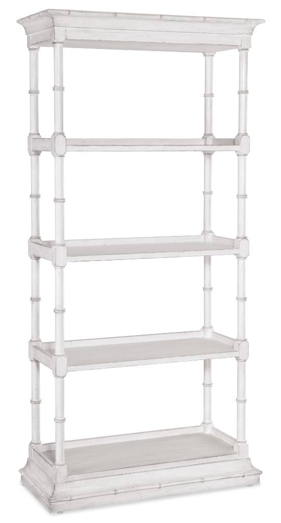 Product Description: Capturing the vintage charm of the coastal South and the tropical craftsmanship of the West Indies, the Charleston Etagere has bamboo-motif posts and crown molding on the top. Crafted of Maple Veneers and resin, it is finished in White Heron, a softer interpretation of the classic Southern limestone white with a slightly brighter sheen, delivering an heirloom-quality finish.