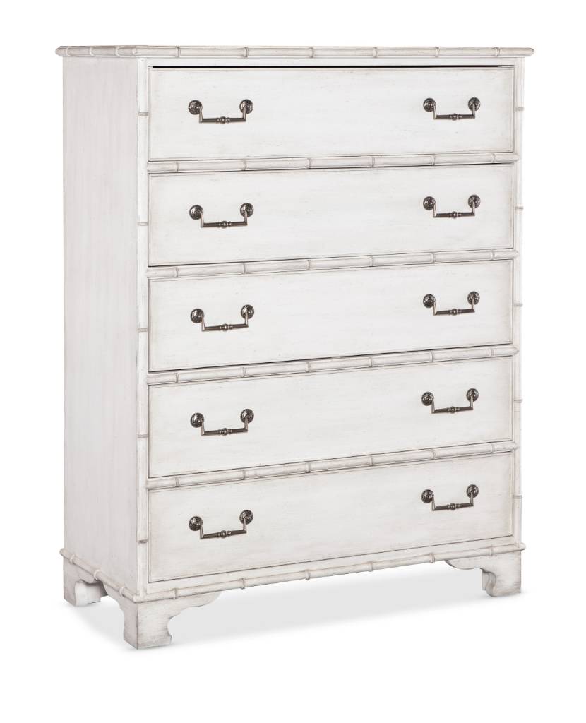 Product Description: Inspired by the tropical craftsmanship of the West Indies and the cane accents of the classic British and Dutch Colonial design periods, the Charleston Five-Drawer Chest has bamboo-motif trim and five drawers with self-closing drawer guides. The wood chest is finished in White Heron, a softer interpretation of the classic Southern limestone white with a slightly brighter sheen, delivering an heirloom-quality finish. The top drawer has a removable felt liner, and the bottom drawer is cedar lined. Accented by antique pewter-colored decorative bail pulls.