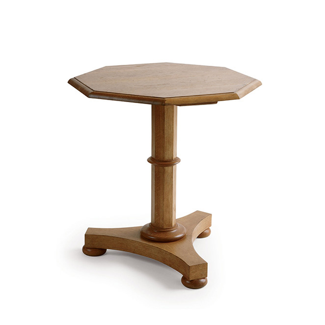 Description : Octagonal oak side table with carved pedestal base on bun feet. Hand-planed, partial planked top. Material : Oak Finish : 21 Antique Oak